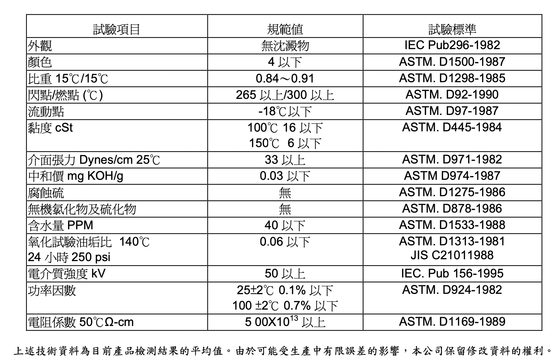 - 極高度絕緣耐力、高度化學穩定性、不侵蝕電機之絕緣物