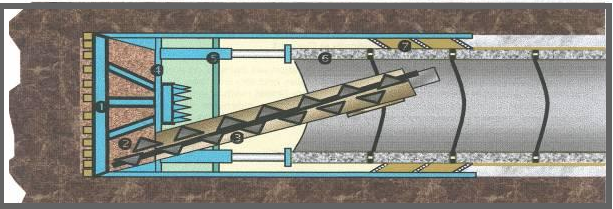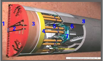 Fig. 5 EPB TBM 1-工作面. 2-挖泥輪. 3-挖泥艙. 4-壓力牆. 5-隧洞千 斤頂. 6-螺旋傳送器. 7-襯筒升降器. 8-裝有襯筒結構的隧道襯筒. |
